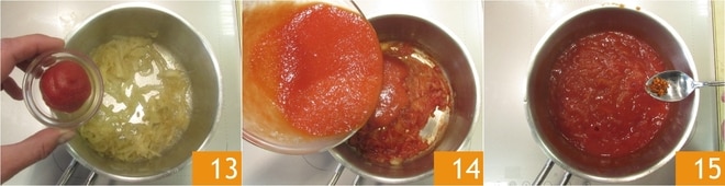 Fügen Sie auch das Tomatenmark 13, das Passata 14 und eine Prise Chili hinzu 15.