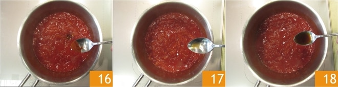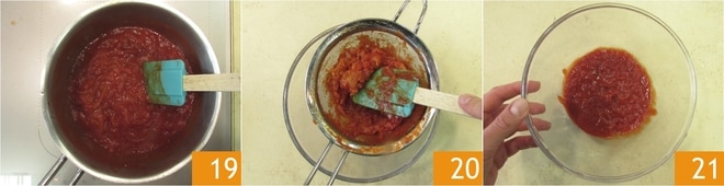 Rühren Sie um und kochen Sie die Sauce noch ein paar Minuten 19, dann passieren Sie sie, um die Zwiebel zu entfernen 20, und bewahren Sie sie in einer Schüssel auf 21.