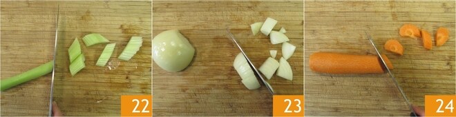 Um den Oktopus vorzubereiten, schälen und schneiden Sie zuerst den Sellerie 22, die Zwiebel 23 und die Karotte 24 in grobe Stücke.