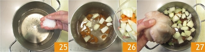Füllen Sie einen großen Topf mit Wasser, dann fügen Sie eine Handvoll grobes Salz 25, weißen Pfefferkörner und das Gemüse hinzu 25. Tauchen Sie den Oktopus ein 27 und kochen Sie ihn 55 Minuten lang, nachdem das Wasser zu kochen beginnt.