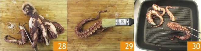 Nachdem er gekocht ist, legen Sie den Oktopus auf ein Schneidebrett und trennen Sie die Tentakel vom Rest des Körpers 28. Pinseln Sie die Tentakel mit Öl ein 29, dann legen Sie sie auf eine heiße Platte, um sie außen knusprig zu machen 30.