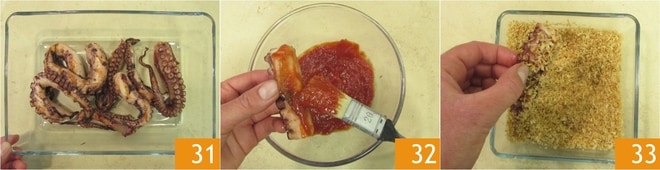 Wenn die Tentakel fertig sind 31, können Sie die Zutaten zusammenstellen: Schneiden Sie die Tentakel in zwei Hälften und pinseln Sie die Seiten und die Unterseite mit der Barbecue-Sauce ein 32, dann bedecken Sie sie mit dem Panko 33, das Sie zuvor in Butter geröstet und auf einem Küchentuch abgetrocknet haben.