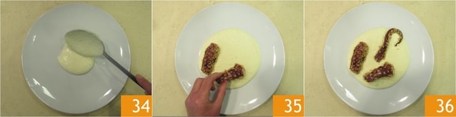 Verteilen Sie die Kartoffelcreme auf dem Teller mit Hilfe der Rückseite eines Löffels 34 und legen Sie die so panierten Tentakel darauf 35. Ihr gegrillter Oktopus auf Kartoffelcreme ist servierfertig 36!
