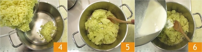 Geben Sie die zerdrückten Kartoffeln in eine Pfanne 4 und lassen Sie sie bei mittlerer Hitze unter Rühren mit einem Kochlöffel trocknen 5. Wenn die Milch-Sahne-Mischung heiß ist, fügen Sie sie langsam der Pfanne hinzu, während Sie umrühren, um sie zu vermischen 6.