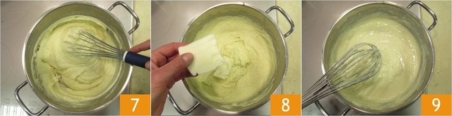 Rühren Sie weiter mit einem Schneebesen 7, dann schalten Sie die Hitze ab und fügen die kalte Butter aus dem Kühlschrank hinzu 8. Mischen Sie gut, um sie gleichmäßig zu integrieren 9. Schließlich salzen, pfeffern und die erhaltene Creme durch ein Sieb passieren, um sie glatt und samtig zu machen.
