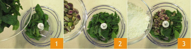 Um den Tomino vom Grill mit gegrilltem Gemüse und Senf zuzubereiten, bereitet ihr zuerst das Pesto zu: Wascht und trocknet die Basilikum- und Minzblätter, gebt sie dann in einen Mixer 1 zusammen mit den Pistazien 2 und dem geriebenen Parmesan 3.<\/p>