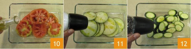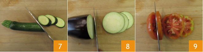 Schneidet die Zucchini 7, die Aubergine 8 und die Tomate in etwa 8 mm dicke Scheiben 9.<\/p>