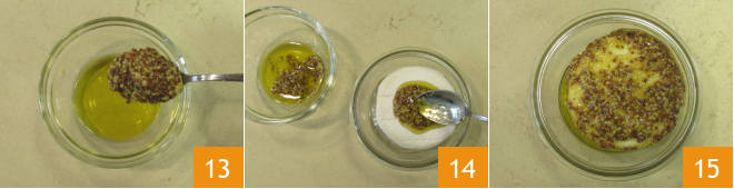 In einer kleinen Schüssel mischt ihr den Senf mit dem Olivenöl 13 und rührt gut um, um eine Emulsion zu erhalten. Bestreicht die Tominos mit der entstandenen Mischung 14 und lasst sie mindestens 30 Minuten, besser über Nacht, marinieren. In diesem Fall stellt ihr sie in den Kühlschrank, ansonsten lasst ihr sie bei Raumtemperatur stehen.<\/p>