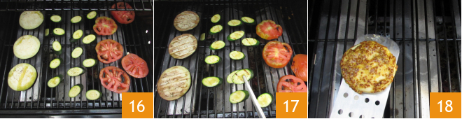 Nach der Marinierzeit könnt ihr mit dem Grillen fortfahren: Legt das Gemüse auf den Grill 16, schließt den Deckel und grillt es auf beiden Seiten 17. Zucchini und Auberginen insgesamt etwa 10 Minuten grillen, während die Tomaten ein paar Minuten weniger brauchen. Sobald sie fertig sind, legt das Gemüse auf den oberen Grillrost und die Tominos auf den unteren 18. Grillt die Tominos für 1-2 Minuten pro Seite, bis sie kurz vor dem Platzen stehen.<\/p>