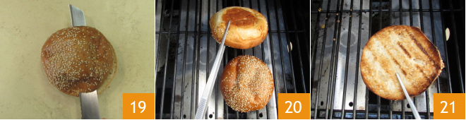 In der Zwischenzeit teilt ihr die Brötchen in zwei Hälften 19 und legt sie mit der Schnittseite nach unten auf den Grill 20, bis sie leicht geröstet sind 21.<\/p>