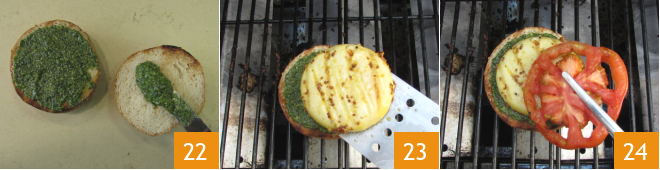 Bestreicht beide Seiten des Brötchens mit dem zuvor zubereiteten Pesto 22 und legt die untere Hälfte zurück auf den Grill, wo ihr direkt den Burger zusammenstellt. Legt den Tomino auf das Brot 23 zusammen mit einer Tomatenscheibe 24.<\/p>
