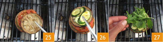 Fügt auch eine Scheibe Aubergine 25 und etwas Zucchini 26 hinzu, dann schließt ihr mit einigen Rucolablättern 27 ab.<\/p>