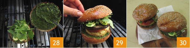 Deckt den Burger mit der oberen Hälfte des Brötchens, das mit Pesto bestrichen ist 28, und drückt leicht an 29. Stellt auf die gleiche Weise auch den zweiten Burger zusammen und genießt sofort euren Tomino vom Grill mit gegrilltem Gemüse und Senf 30!<\/p>