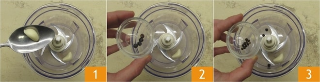 Um das gegrillte Tomahawk zuzubereiten, nehmt als erstes das Fleisch aus dem Kühlschrank und lasst es mindestens eine Stunde bei Zimmertemperatur ruhen. Bereitet das aromatisierte Salz zu: Gebt die geschälten Knoblauchzehen 1 zusammen mit den Wacholderbeeren 2 und den Pfefferkörnern 3 in einen Mixer.