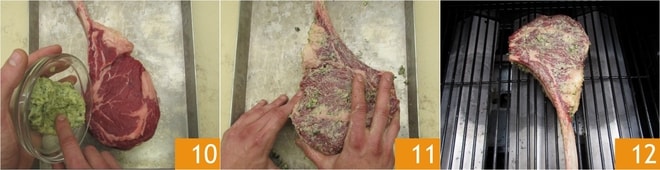 Massiert das Fleisch mit dem aromatisierten Salz 10, um es von allen Seiten gut zu würzen 11. Jetzt geht es ans Garen: Legt das Steak auf den gut heißen Grill und bratet es 10 Minuten lang an, achtet darauf, dass die Flamme nicht zu stark ist 12.