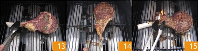 Nach 10 Minuten verwendet die Zange, um das Fleisch senkrecht zum Grill zu wenden, und bratet es auf diese Weise weitere 5 Minuten 13. Dreht es dann auf die andere Seite und lasst es weitere 10 Minuten garen 14, danach legt es auf die andere Seite senkrecht und bratet es weitere 5 Minuten. Die Kerntemperatur sollte 55°-60° erreichen.