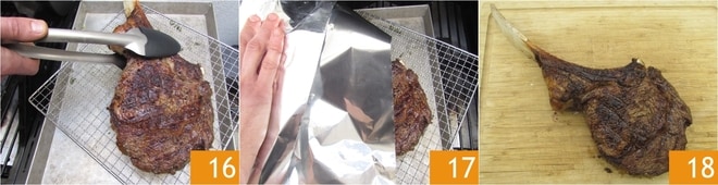 Nach dem Garen legt das Steak auf einen Rost, den ihr über ein Backblech gelegt habt 15, deckt es mit einem Blatt Aluminiumfolie ab 16 und lasst es an einem warmen Ort etwa 10 Minuten ruhen. So wird das Fleisch gleichmäßig erwärmt und die Säfte verteilen sich im Inneren. Euer gegrilltes Tomahawk ist bereit zum Genießen 18!