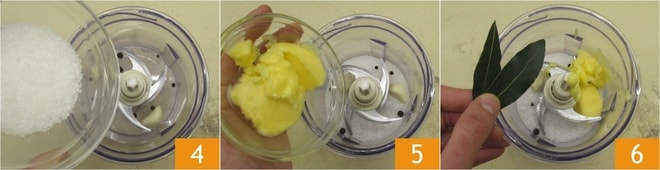 Fügt das grobe Salz 4, die geklärte Butter 5 und die Lorbeerblätter 6 hinzu.