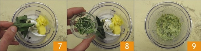 Zum Schluss fügt den Salbei 7 und den Rosmarin 8 hinzu und mixt, um eine homogene Mischung zu erhalten 9.