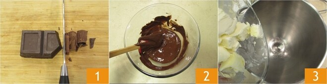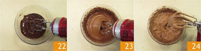 Rühren Sie mit den Rührgeräten, um sie vollständig zu schmelzen 22. Sobald die Schokolade geschmolzen ist, geben Sie die Masse in eine Schüssel mit Eis und rühren Sie weiter mit einem elektrischen Mixer 23, bis sie gut aufgeschlagen ist 24.