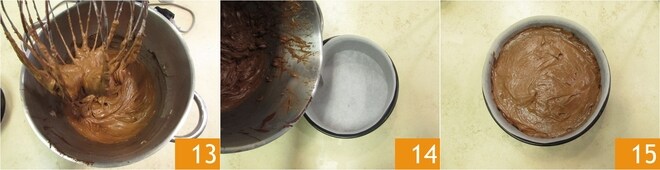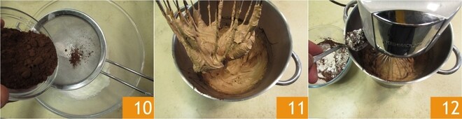 Sieben Sie auch den Kakao 10. Nehmen Sie den gut vermischten Teig 11 und fügen Sie die gesiebten Zutaten hinzu 12.