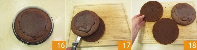 Nach dieser Zeit überprüfen Sie den Gargrad mit einem Zahnstocher, nehmen Sie den Kuchen heraus und lassen Sie ihn abkühlen 16, bevor Sie ihn aus der Form nehmen. Sobald er kalt ist, schneiden Sie den Kuchen in 3 Scheiben 17 18.