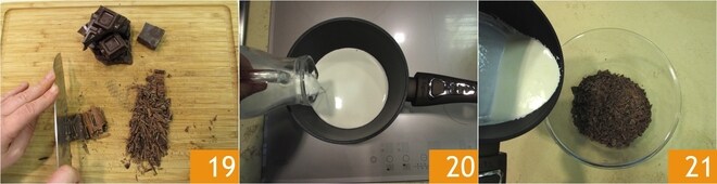 In der Zwischenzeit bereiten Sie die Schokoladen-Ganache zu. Hacken Sie die Zartbitterschokolade 19 und erhitzen Sie in einem kleinen Topf die Sahne 20. Wenn die Sahne kurz vor dem Kochen ist, gießen Sie sie über die gehackte Schokolade 21.
