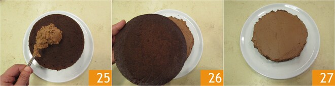 Nun streichen Sie die Ganache mit einem Spatel auf die erste Scheibe 25, legen Sie die zweite Scheibe auf 26 und drücken Sie sie gut an. Vervollständigen Sie es mit der dritten Scheibe und bestreichen Sie auch die Oberfläche mit der Ganache 27, indem Sie sie mit einem Spatel verteilen. Stellen Sie den Kuchen in den Kühlschrank, während Sie die Geister vorbereiten.