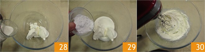In einer Schüssel schlagen Sie den Mascarpone mit der Sahne 28 und dem Puderzucker 29, schlagen Sie mit den elektrischen Rührgeräten 30, bis er fest ist 30. Geben Sie die Creme in einen Spritzbeutel mit einer runden Tülle von 15 mm Durchmesser.