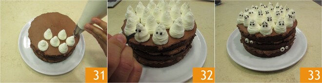 Formen Sie die Geister, indem Sie kleine Tupfen auf die Oberfläche des Kuchens spritzen 31 und dekorieren Sie sie mit Schokostreuseln und Schokodrops, um Augen und Augenbrauen zu formen 32. Lagern Sie Ihren Geisterkuchen im Kühlschrank bis zum Servieren 33!