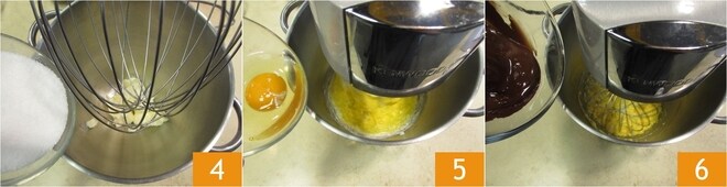 Fügen Sie den Zucker hinzu 4, geben Sie eine Prise Salz hinzu und schlagen Sie mit den elektrischen Rührgeräten, bis die Masse weich und cremig ist. Fügen Sie 2 der 4 Eier hinzu 5 und rühren Sie weiter, bis alles vollständig absorbiert ist. Geben Sie die geschmolzene Schokolade hinzu 6 und vermischen Sie die Masse mit den Rührgeräten.