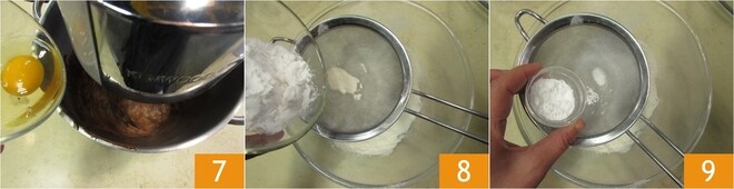 Fügen Sie die restlichen Eier hinzu 7 und mischen Sie mit den Rührgeräten, bis alles vollständig absorbiert ist. Sieben Sie nun das Mehl 8, die Kartoffelstärke und das Backpulver 9 in eine Schüssel.