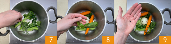 In den Schnellkochtopf mit einem Fassungsvermögen von 6L geben Sie das Gemüse 7 mit dem Thymianzweig 8, dem Petersilienzweig und Lorbeerblatt. Schließlich geben Sie die Pfefferkörner hinzu 9.