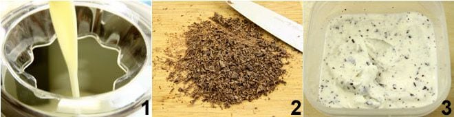 Um das Stracciatella-Eis zuzubereiten, beginnen Sie damit, das Sahneeis gemäß unserem Videorezept zuzubereiten 1, Sahneeis. Während das Eis in der Eismaschine ist, hacken Sie 100 g Zartbitterschokolade mit einem Messer fein 2 oder verwenden Sie, falls verfügbar, bereits fertige Schokostückchen; eine Minute bevor Sie die Eismaschine ausschalten, fügen Sie sie dem Sahneeis hinzu. Geben Sie dann das Stracciatella-Eis in einen Behälter 3 und stellen Sie es für mindestens 3 Stunden in den Gefrierschrank, bevor Sie es genießen!