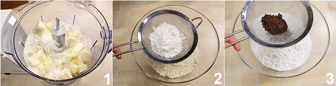 Um das Eis-Sandwich zuzubereiten, beginnen Sie mit der Zubereitung des Keksteigs: Zerkleinern Sie die kalte Butter in Stückchen mit dem Mehl in einem Mixer 1, geben Sie das resultierende Pulver in eine große Schüssel und sieben Sie auch den Puderzucker und den Kakao hinein (2-3). Mischen Sie die Mehle gut miteinander.