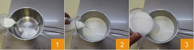 Um das Minze-Schokolade-Eis zuzubereiten, gießen Sie zuerst die Milch in einen Topf 1, erhitzen Sie sie, indem Sie die frische Sahne hinzufügen 2, und geben Sie den Zucker hinzu 3.