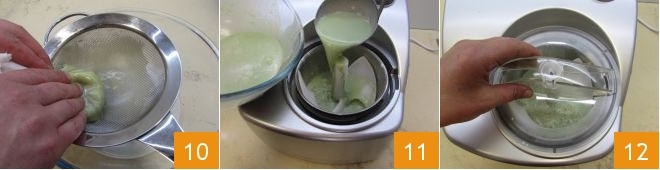 Gut ausdrücken 10, um sicherzustellen, dass die Mischung vollständig gefiltert ist, alles in die Eismaschine geben 11 und für 30 Minuten einschalten 12.