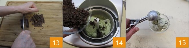 Nach 30 Minuten die dunkle Schokolade grob mit einem Messer hacken 13. Dann in die Eismaschine geben 14, für ein paar Minuten einschalten, und Ihr Minze-Schokolade-Eis ist fertig. Wenn Sie keine Eismaschine haben, geben Sie die flüssige und auf Raumtemperatur abgekühlte Mischung in eine Schüssel in den Gefrierschrank, und rühren Sie jede halbe Stunde, bis Sie die perfekte Konsistenz erreicht haben. Sobald die Eismaschine gestoppt ist, in einen flachen und breiten Behälter, vorzugsweise aus Glas oder Stahl, umfüllen und für mindestens 2-3 Stunden in den Gefrierschrank stellen, bevor es serviert wird 15.