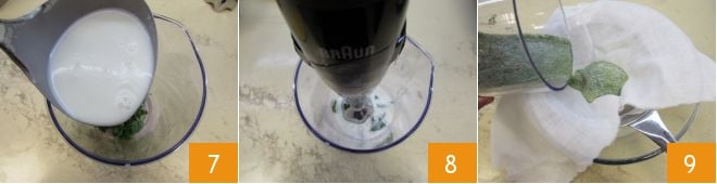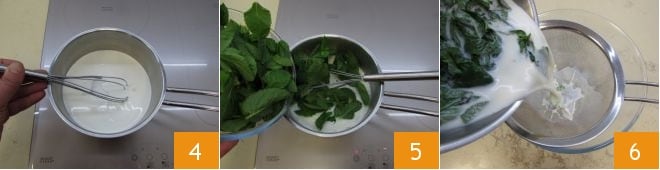 Nehmen Sie etwa die Hälfte der Minzblätter, geben Sie sie dann in den Mixer zusammen mit der Milch und der Sahne 7 (wenn Sie einen intensiveren Minzgeschmack wünschen, können Sie alle Blätter pürieren), und pürieren Sie alles 8. Dann durch ein Musselin-Tuch (Küchengaze) die Mischung in eine Schüssel mit Hilfe eines Siebs filtern 9.