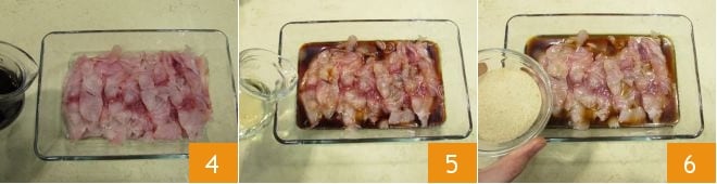 Legen Sie die dünnen Scheiben der Gelbschwanzmakrele in eine Auflaufform und fügen Sie die glutenfreie Sojasauce 4, den Essig 5 und den braunen Zucker 6 hinzu.