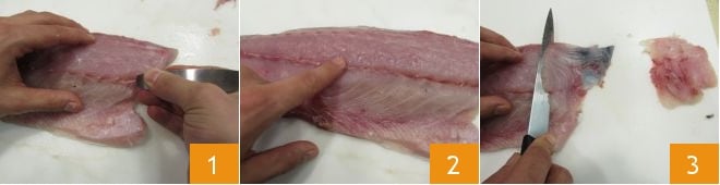 Um das Carpaccio von Gelbschwanzmakrele mariniert in Sojasauce zuzubereiten, müssen Sie zunächst sicherstellen, dass Sie ein bereits gebleichtes Filet haben; wir empfehlen, das Filet mindestens 96 Stunden lang bei -18 Grad einzufrieren und dann aufzutauen, um es in der Rezeptur zu verwenden. Nehmen Sie nun Ihr Filet und entfernen Sie die Gräten mit einer Pinzette 1, um sie zu finden, streichen Sie einfach mit den Fingern über das Filet 2. Schneiden Sie das Filet nun in sehr dünne Scheiben, indem Sie diagonale Schnitte machen 3.