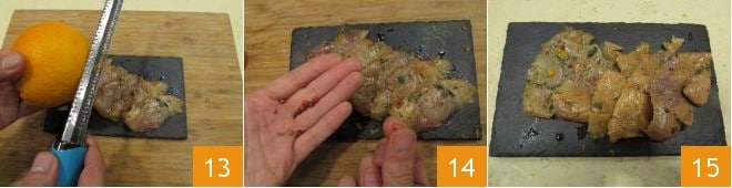 Vervollständigen Sie das Gericht, indem Sie frisch geriebene Orangenschale hinzufügen 13 und rosa Pfefferkörner 14. Nun können Sie Ihr Carpaccio von Gelbschwanzmakrele in Sojasauce servieren 15.