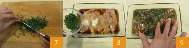 Hacken Sie den Dill fein 7 und fügen Sie ihn dem Rest der Marinade hinzu 8. Achten Sie darauf, dass die Scheiben der Gelbschwanzmakrele vollständig von den Flüssigkeiten bedeckt sind 9,