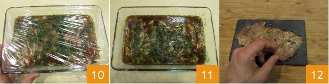 decken Sie dann alles mit Frischhaltefolie ab 10 und lassen Sie es mindestens 2 Stunden im Kühlschrank marinieren 11. Lassen Sie dann die Scheiben der Gelbschwanzmakrele aus der Marinade abtropfen und legen Sie sie auf eine Servierplatte 12.