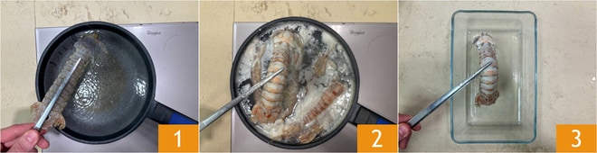 Um die gemischte Pasta mit Krebsscheren und Garnelenschwänzen zuzubereiten, beginnen Sie mit dem Kochen der Krebsscheren: Blanchieren Sie die ganzen Krebse für etwa 20 Sekunden in Wasser 1, dann abseihen 2 und in eine Schüssel geben 3.