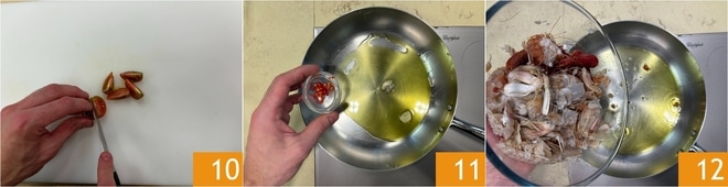 Waschen Sie die Tomaten und schneiden Sie sie in Spalten 10. Erwärmen Sie in einer Pfanne etwas Olivenöl mit dem Knoblauch und der Chilischote 11. Geben Sie alle Reste von der Reinigung der Garnelen und der Krebse hinzu 12.