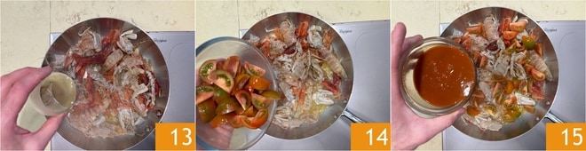Braten Sie kurz an, dann mit Weißwein ablöschen 13 und den Alkohol verdampfen lassen. Fügen Sie nun die Tomaten und das Tomatenpüree hinzu 15.