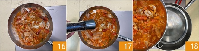 5 Minuten kochen lassen 16, während des Kochens salzen und pfeffern 17. Filtern Sie den Fond durch ein Sieb und sammeln Sie die Flüssigkeit in einer anderen Pfanne 18.