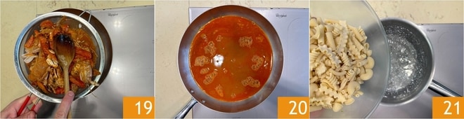 Drücken Sie die Reste gut aus, um die Säfte zu extrahieren 19. Den erhaltenen Fond beiseitelegen 20 und in der Zwischenzeit die Pasta für die Hälfte der auf der Packung angegebenen Kochzeit kochen 21.
