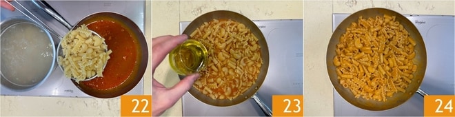 Die Pasta direkt bei halber Garzeit in die Pfanne mit dem gefilterten Fond abgießen 22. Die Garzeit beenden, dann mit Olivenöl vermischen 23 und umrühren, um zu mischen 24.
